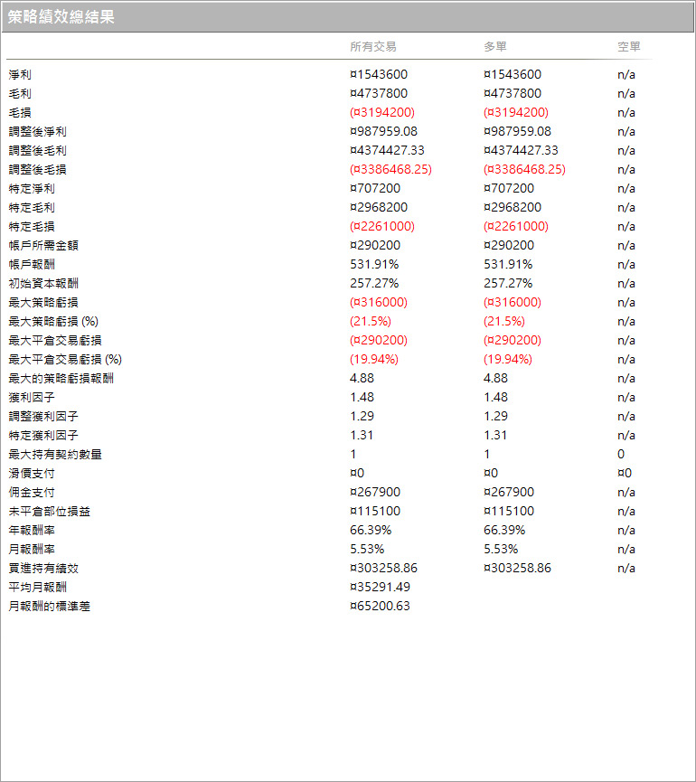 | S21Q100 | 範例策略 | 1543600 | -316000 | 4.88 | 1.48 | 35253 | 0.55 | 38% | 2.41 | 94800 | 117600 | 109800 | 589800 |
